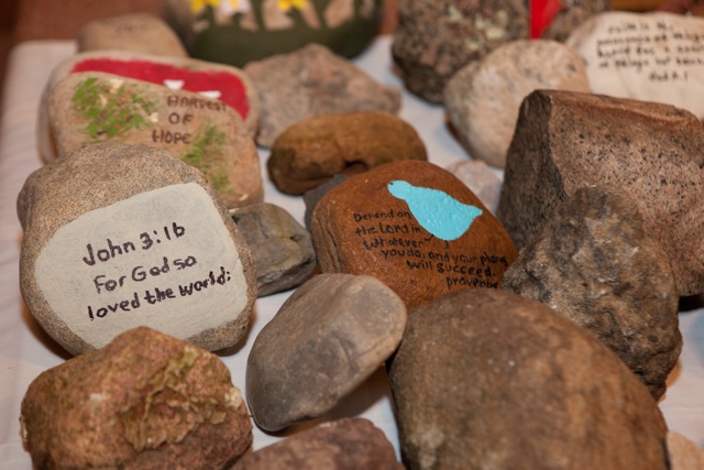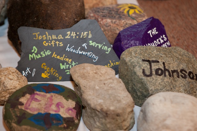 These are the rocks that were brought forward on Cornerstone Sunday, beautifully expressing the variety of skills, talents and life situations that God blesses us with; making each of us a vital cornerstone within the body of Christ, a.k.a. the church. Deepest thanks to all those to who took the time and the effort to express themselves through these rocks, and many thanks to Amanda for sharing these wonderful pictures with us! (You can click on each of the pictures to enlarge them.)